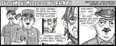 The Jimi Homeless Experience is an online social/political cartoon strip created and written by Jon Kinyon.[1] The webcomic is drawn by underground artist Big Tasty, who is a frequent contributor to Girls and Corpses Magazine. The strip is primarily about a small group of social outcasts and proudly flaunts its Grotesque orientation and black humor.
