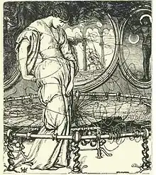 To her left is an oval roundel of the adoration of the Christ Child by Mary (representing humility), based on a work by Lucca della Robbia that Hunt owned.[3] The roundel on her right shows a haloed Hercules (representing valour) during his labour to take apples from the garden of the Hesperides, who slept while their guardian serpent (under Hercules's left foot) was defeated.[4] As a study for this detail, Hunt made an actual plaster bas-relief, now in the Manchester Art Gallery.[5] The Hesperides' failure in their duty mirrors the lady’s.[5]