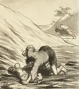 Honoré Daumier made an oil painting of La Fontaine's fable (c.1858-60) which is on display in the Musée d'Orsay. It is based on a lithograph of street fighters which appeared in Le Charivari on 23 August 1845, the preliminary drawing for which is also in the same museum. The painter emphasises the fight between the thieves in the foreground, standing out against the over-all dark colouring, while in the background, hidden in the shadows, the flight of the third thief on the ass is roughly sketched in.[22] Among other 19th century French artists who have treated the subject are François Chifflart[23] and Paul Cézanne.[24] The former features two thieves fighting in the lower foreground of a wide landscape, with the third galloping towards a path up the distant cliffs. Cézanne's later painting (1879/80) has a group of four thieves struggling in one corner of a dynamic seaside landscape over which loom cliffs and pines; the ass is peaceably wandering downhill towards two seated characters, one of whom is smoking.