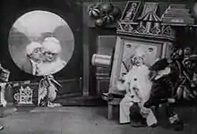 In planning the film, Méliès used the toy lantern not only as a focal point for his toys-coming-to-life theme, but also as an adaptation of magic tricks where people and things can be taken from or hidden inside a magical box.[3] A Centre national de la cinématographie guide to Méliès's films notes that the toys featured are "the classic characters of pantomime".[4] Méliès's American catalogue advertises the film as including a new special effect, superimposition on a white background. In fact, Méliès worked the trick differently: actually the special effect, a filmed scene matted into a circle, is superimposed by multiple exposure onto a black background, as was Méliès's typical practice. Other technical effects used in the film are worked by substitution splices and dissolves.[4]