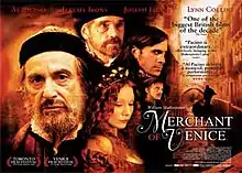 The Merchant of Venice received generally positive reviews; it has a "fresh" rating of 72% at Rotten Tomatoes based on 124 critic reviews, with the consensus, "A respectable if uneven take on the Bard's The Merchant of Venice."[5] On Metacritic the film has an average score of 63/100.[6] Most critics praised both the interpretation of the Shylock character by Michael Radford and Al Pacino[3] and the dark, realistic look of the streets of Venice, for which production designer Bruno Rubeo was honoured by the Italian National Syndicate of Film Journalists. Reception to the film's treatment of antisemitism was mixed, with some critics praising Radford's contextualizing choices but feeling that they were nonetheless unable to fully prevent Shylock from being an antisemitic caricature,[7][8] and others feeling that Shylock's villainy was sanitized in order to make him into an overly sympathetic victim of prejudice.[9] The film was noted for its emphasis on the love triangle aspect of Bassanio's relationships with Antonio and Portia, including a kiss between Bassanio and Antonio.[10]
