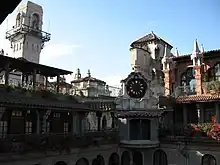Miller's vision for the eclectic structure was drawn from many historical design periods, revivals, influences, and styles. Some are Spanish Gothic architecture, Mission Revival Style architecture, Moorish Revival architecture, Spanish Colonial style architecture, Spanish Colonial Revival Style architecture, Renaissance Revival architecture, and Mediterranean Revival Style architecture. With one section over another, addition upon addition, the result is a complicated and intricately built structure. It contains narrow passageways, exterior arcades, a medieval-style clock, a five-story rotunda, numerous patios and windows, castle towers, minarets, a Cloister Wing (with catacombs), flying buttresses, Mediterranean domes and a pedestrian sky bridge among many other features.