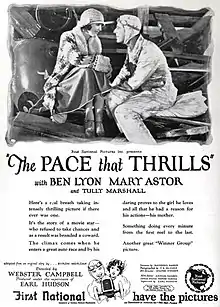 The Pace That Thrills is a 1925 American silent drama film directed by Webster Campbell and starring Ben Lyon, Mary Astor, and Charles Byer.[1][2] It was released by First National.