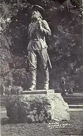In a 1928 newspaper article, the statue was described as standing "in the center of the campus", and depicting "the pioneer spirit of the West".[12] In 1929, the statue was guarded against vandalism, along with other Eugene landmarks, prior to the homecoming football game rivalry with Oregon State University.[13] An editorial in the Eugene Guard in 1931 mentioned, in the context of the in-state rivalry: "Orange paint of the hue so popular in the vicinity of Corvallis daubs the pavements at the University, the big 'O' on Skinner's Butte, even the famous Pioneer statue."[14]