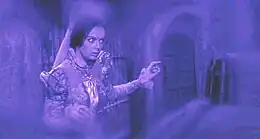 To create the flashbacks revealing Nicholas' traumatic experiences, Corman and Crosby attempted to shoot them in a manner that would convey to the audience the character's horror in dredging up nightmares trapped in his subconscious. Corman insisted on these images having a dream-like quality, "twisted and distorted because they were being experienced by someone on the rim of madness." Corman decided to film the flashbacks in monochrome, since he had read that some psychiatrists believe most people dream in "black-and white" imagery. Crosby used wide-angle lenses, violent camera movement, and tilted camera angles to represent the character's feeling of hysteria. The sequences were then printed on blue-tinted stock which was subsequently toned red during development, effectively producing a two-tone image. The highlights were blue, with the shadows rendered as red...producing a deep, bloody quality. The image was then run through an optical printer where the edges were vignetted and a twisted linear distortion was introduced.[19]