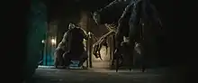 The main feature of this work's VFX is the monsters. Yasuki Miyano one of the production members was the one who undertook everything from the designs to asset production and even shot sculpting. At first, he started production with reference to the original manga. During the work, sketches drawn by the original author when writing the manga were provided as additional materials, and a concept model was created. They planned to make four monsters, but in the end they decided to make three from the viewpoint of balancing cost and quality. The production includes the creation of the background concept, from the concept design of the monsters to the modeling, to the final product. In addition to the gate and pillars, the Grace Field House is also added using CGI. The gate is made in Cinema 4D and rendered using Redshift, the inside of the gate also uses a lot of CGI as an addition to the set. Because of the budget, they were only able to build the first floor of the set, so they used Cinema 4D to make up for the shortfall.[17]