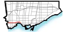 The Queensway (or Queensway) is a major street in the municipalities of Toronto and Mississauga, Ontario, Canada. It is a western continuation of Queen Street, after it crosses Roncesvalles Avenue and King Street in Toronto. The Queensway is a divided roadway from Roncevalles westerly until 600 metres of the South Kingsway (accessed by ramps) with its centre median dedicated to streetcar service. The road continues undivided west from there to Etobicoke Creek as a four- or six-lane thoroughfare.