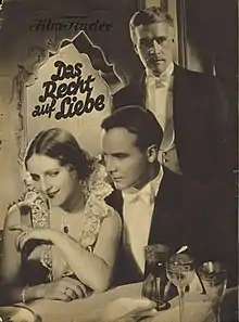 The Right to Love (German: Das Recht auf Liebe) is a 1930 German silent drama film directed by Jacob Fleck and Luise Fleck and starring Georg Alexander, Evelyn Holt, and Georgia Lind. The film addresses the issue of the rights of ex-soldiers made impotent by war wounds to get married.[1] It is in the Weimar tradition of Enlightenment films.