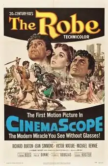 The Robe is a 1953 American fictional Biblical epic film that tells the story of a Roman military tribune who commands the unit that is responsible for the Crucifixion of Jesus. The film was released by 20th Century Fox and was the first film released in the widescreen process CinemaScope.[4] Like other early CinemaScope films, The Robe was shot with Henri Chrétien's original Hypergonar anamorphic lenses.