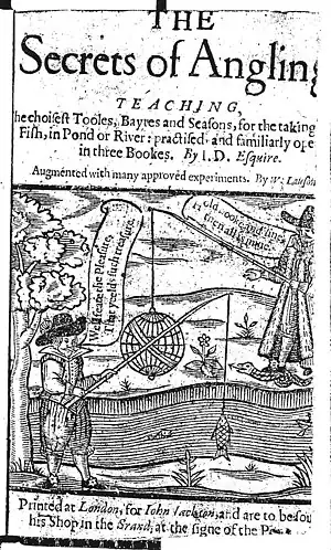 First published in 1613,[1][2] Dennys's book was published after his death.[nb 1] The author was identified by the initials J.D., and had been attributed to up to 6 poets. In 1811 the authorship was determined from a "23mo Martii, 1612" (i.e., 1613) entry in the Stationers' Registers, which showed that Dennys authored the book.[3] The Secrets of Angling was published in 4 editions, the last in 1652, and copies are amongst the rarest books in existence.[2][nb 2]