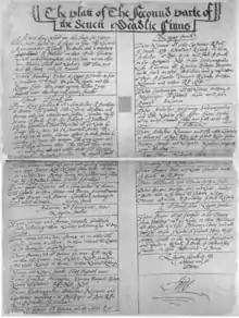 The play is significant, however, because the "plot" of Part 2 still exists; it was discovered in the cover of a 17th-century manuscript play, The Tell Tale, in a collection at Dulwich College. Originally assumed to be part of Edward Alleyn's papers, subsequent investigation suggests it was part of the collection bequeathed by player-bookseller William Cartwright the younger (c.1606–86), and was obtained by Edmond Malone when he traded the college some old religious tracts for plays from the Cartwright bequest.[2] As the term was used in English Renaissance theatre, the "plot" of a play was a chart that summarized its action; it was posted in the "tiring house" or backstage area of a theatre. The plot of S.D.S. 2 has a square hole punched in its middle, where it was hung on a board for all to read. The cast members of an Elizabethan dramatic production had their own parts written out for them, with relevant entrances and cues — but they did not have their own individual copies of the play text as a whole. So the posted plot was an important resource in keeping the production organized. Surviving Elizabethan plots are extremely rare — only half a dozen exist.[3]