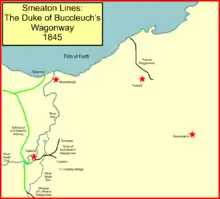Buccleuch's tramway ran from the Dalkeith station of the Edinburgh and Dalkeith Railway, running east through the streets of Dalkeith, crossing the present day Buccleuch Street and Newmills Road diagonally to the location of the Elmfield ironworks of William Mushet. It then turned north-east to the South Esk Bridge, named Victoria Bridge; it was immediately south of the present-day Musselburgh Road bridge. The tramway then forked, running south-east to serve Cowden coalpit, and north to Smeaton Colliery (belonging to the Marquis of Lothian) and Smeaton Brick Works.[1]
