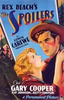 The Spoilers is a 1930 American Pre-Code Western film directed by Edwin Carewe and starring Gary Cooper, Kay Johnson, and Betty Compson. Set in Nome, Alaska during the 1898 Gold Rush, the film is about a gold prospector and a corrupt Alaska politician who fight for control over a gold mine. The film features a spectacular saloon fistfight between Cooper and William "Stage" Boyd.[1]