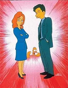 The episode was produced by Al Jean and Mike Reiss, who had served as showrunners of seasons three and four. They returned to the show to produce this and several other episodes while under contract with The Walt Disney Company.[4] The episode was written by Reid Harrison and directed by Steven Dean Moore.[2] It had one of the longest episode gaps between its conception to the time it was finished.[5] The idea was first conceived at a story retreat. Jean found a copy of TV Guide while in the bathroom, with The X-Files on the cover. Feeling a crossover would be a good idea, he came back into the room, told Reiss his idea, and the pair pitched it.[5] None of the other staff wanted to do it, so Reiss and Jean decided to do it themselves.[5] Before the episode was produced, the script was sent to Chris Carter, the creator of The X-Files, who said that it was an "honor" to be satirized by The Simpsons.[5][6] Jean was worried that the episode was not funny, as at the table reading there were only a few of the writers present and as such, the script got no laughs at all.[5] It took a long time to come up with an ending, and an explanation for the alien. Originally, it was just going to be left as a mystery.[7] Mulder and Scully's office was designed to be exactly the same as the one used in The X-Files.[8] After it had been finished, Fox sent the episode out for a critical review, which was "really great".[7] The scene with the "Homer is a dope" T-shirts originally had an extra line: "I told you, we're sold out!", thus filling in the plot error in the actual episode in which Homer asks for some T-shirts, despite just being told that they were sold out.[8] The scene after Homer's first encounter with the alien, in which he runs through a field writing "Yahhh!" in the grass, was written by David M. Stern, and added in after the original read-through.[5]