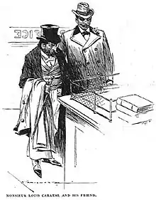 ![]() Caratal and his bodyguard in a railway station office, illustrated by Max Cowper (The Strand Magazine, 1898) | |