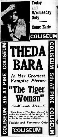 The Tiger Woman is a 1917 American silent drama film directed by J. Gordon Edwards and George Bellamy and starring Theda Bara. The film is now considered lost.[1] [2]