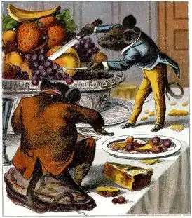British poetical treatments of the story vary widely. The Scottish Henryson's The Taill of the Uponlandis Mous and the Burges Mous[11] makes the two mice sisters.[12] The one in the country envies her sister's rich living and pays her a visit, only to be chased by a cat and return home, contented with her own lot. Four final stanzas (lines 190–221) draw out the moral that it is better to limit one's ambition and one's appetites, warning those who make the belly their god that "The cat cummis and to the mous hes ee".