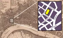 A playhouse known as the Cockpit Theatre used by Queen Anne's Men on Drury Lane was targetted by rioting apprentices on 4 March 1617.[4] After the eleven-year-long Puritan Interregnum, which had seen the banning of pastimes regarded as frivolous, such as theatre, the English monarchy was restored to the throne with the return of Charles II in 1660. Soon after, Charles issued Letters Patent to two parties licensing the formation of new acting companies. One of these went to Thomas Killigrew, whose company became known as the King's Company, and who built a new theatre in Drury Lane. The Letters Patent also granted the two companies a shared monopoly on the public performance of legitimate drama in London; this monopoly was challenged in the 18th century by new venues and by a certain slipperiness in the definition of "legitimate drama," but remained legally in place until 1843.[5] The new playhouse, architect unknown, opened on 7 May 1663 and was known from the placement of the entrance as the "Theatre Royal in Bridges Street."[lower-alpha 1] It went by other names as well, including the "King's Playhouse." The building was a three-tiered wooden structure, 112 ft (34 m) long and 59 ft (18 m) wide; it could hold an audience of 700.[6] Set well back from the broader streets, the theatre was accessed by narrow passages between surrounding buildings.[7]