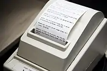 Thermal printing (or direct thermal printing) is a digital printing process which produces a printed image by passing paper with a thermochromic coating, commonly known as thermal paper, over a print head consisting of tiny electrically heated elements. The coating turns black in the areas where it is heated, producing an image.[2]