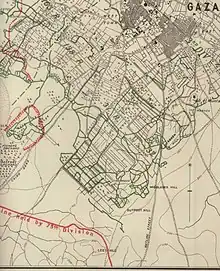 The EEF's occupation of Gaza, which had a pre-war population of approximately 40,000, was not strongly resisted and a general advance during the morning of 7 November found the town abandoned.[68] Orders for an attack at 04:50 by the 75th Division on Outpost Hill on the eastern side of Gaza had been issued; these were expanded to include Middlesex Hill and a 54th (East Anglian) Division attack on the Belah and Yunis trenches, and Turtle Hill in the coastal sector.[63][72][75] However, by 04:35, two battalions each from the 161st and the 162nd Brigades (54th Division) supported by artillery had already advanced to occupy Lion and Tiger Trenches and Sheikh Redwan in the coastal sector to the north-north-west of Gaza. The advance by the 162nd Brigade took them through "the gardens and fields of Gaza to the main road northwards", when patrols sent into the city found it deserted; EEF artillery bombardments of Gaza had severely damaged or destroyed the majority of the city's housing. The 54th (East Anglian) Division subsequently took up a line stretching from the Jaffa road north of Sheikh Redwan to the Mediterranean sea.[82][83]
