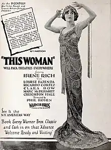 This Woman is a 1924 American silent drama film directed by Phil Rosen, written by Louis D. Lighton and Hope Loring, and starring Irene Rich, Ricardo Cortez, Louise Fazenda, Frank Elliott, Creighton Hale, and Marc McDermott. Based on the 1924 novel This Woman by Howard Rockey, it was released by Warner Bros. on November 2, 1924.[1][2][3]