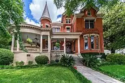 It is a Victorian house sitting among a row of Greek Revival mansions. It has a series of gables and chimneys, and a round tower topped with a wrought iron finial and skirted with a porch. It features stained glass and terra cotta trim typical of Queen Ann style architecture, and has been called "one of the finest Queen Anne type houses anywhere in the country."[2]: 4 There is a carriage house to the rear of the main house.[2]