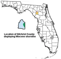 Gilchrist County, Florida and Miocene shoreline based on the Florida Geologic Survey.