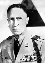 In 1941, Japan invaded the Philippines, routing combined U.S.-Filipino defensive forces. During their withdrawal into the Bataan Peninsula in December, Trapnell, commanding a unit of the 26th Cavalry, fought a desperate rear-guard action that included the last tactical cavalry charge of the U.S. Army.[10] Using a medical truck to block one of the bridges used by retreating Fil-Am force and setting it afire, Trapnell then remained at this position under constant fire until it was rendered unpassable.[2][11] Although he had a command car with which to beat a hasty retreat, he instead withdrew slowly with a picked force retrieving wounded soldiers along the way. For this engagement he was awarded the Distinguished Service Cross and commended by Gen. MacArthur:[12] "With complete disregard for his safety, Major Trapnell delayed the hostile advance and set an inspiring example to his entire regiment."[3]