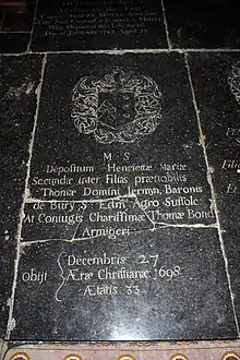 Inscribed in Latin: M(emoriae) S(acrum) depositum Henriettae Mariae secundae inter filias praenobilis Thomae Domini Jermyn Baronis de Bury S. Edm. agro Suffolc. at conjugis charissimae Thomae Bond Armigeri. Obiit Decembris 27 aerae Christianiae 1698 aetatis 33 (Sacred to the memory: the remains of Henrietta Mary the second amongst the daughters of the most noble Thomas, Lord Jermyn, Baron of Bury St Edmunds in the County of Suffolk and most dear wife of Thomas Bond, Esquire. She died 27 of December, of the Christian era, 1698, of her age 33"). Arms: Argent, on a chevron sable three bezants (Bond) (Burke, Sir Bernard, The General Armory, London, 1884, p.98 "Bond of Earth & Saltash, Cornwall") impaling Sable, a crescent between two mullets in pale argent (Jermyn).