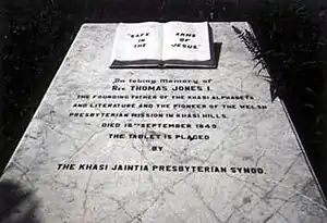 Thomas Jones (24 January 1810 – 16 September 1849)[1] was a Welsh Christian missionary, who worked among the Khasi people of Meghalaya and Assam in India and of Bangladesh. He recorded the Khasi language in Roman script, and the inscription on his gravestone calls him "The founding father of the Khasi alphabet and literature".