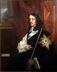 Thomas Wriothesley, 4th Earl of Southampton, KG (/ˈraɪəθsli/ RY-əth-slee;[1] 10 March 1607 – 16 May 1667), styled Lord Wriothesley before 1624, was an English statesman, a staunch supporter of King Charles II who after the Restoration of the Monarchy in 1660 rose to the position of Lord High Treasurer, which term began with the assumption of power by the Clarendon Ministry. He "was remarkable for his freedom from any taint of corruption and for his efforts in the interests of economy and financial order",[2] a noble if not a completely objective view of his work as the keeper of the nation's finances.[3] He died before the impeachment of Lord Clarendon, after which the Cabal Ministry took over government.