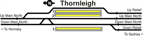 Thornleigh station opened on 17 September 1886.[2] Platform 1 is located on a loop and does not have any booked passenger workings, while south of the station, the line has a loop on each side as far as Pennant Hills.