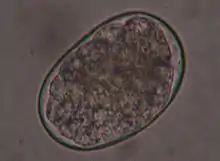 Females of A. caninum release eggs about 65×40 µm in size, which already have 4-10 furrowing stages at deposition. They are oval and thin-shelled and enter the outside world via feces. The prepatency is two to four weeks. The larvae released from the eggs can bore through the skin into a new host (percutaneous infection) or be ingested perorally - mostly via collective hosts such as rodents. As with T. canis, infection of puppies is also possible through the mother's milk (galactogenic infection). Larvae dormant in the mammary gland can be shed over a period of up to three suckling periods after a bitch has been infected once.[19]