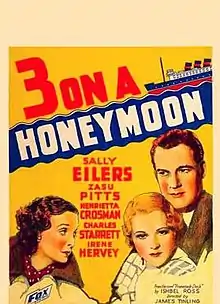 Three on a Honeymoon is a 1934 American Pre-Code comedy film directed by James Tinling, written by Edward T. Lowe Jr. and Raymond Van Sickle, and starring Sally Eilers, ZaSu Pitts, Henrietta Crosman, Charles Starrett, Irene Hervey and Johnny Mack Brown. It is based on the 1932 novel Promenade Deck by Ishbel Ross. The film was released on March 23, 1934, by Fox Film Corporation.[1][2][3]