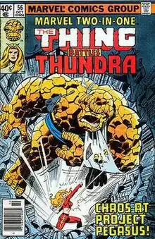 She later battled the Hulk, who was possessing the Thing's body at the time.[6] Thundra later assisted the Fantastic Four against the Frightful Four again,[7] and then assisted the Fantastic Four against Namor the Sub-Mariner.[8] Her time travel from 23rd century Femizonia, an alternate future Earth ruled by women, to prevent the formation of Machus, a planet in her alternate future dimension ruled by men, was finally revealed. Alongside the Fantastic Four, she battled Mahkizmo. She ultimately remained in the 20th century after a dimensional interface of Femizonia and Machus occurred.[9] She later assisted the Fantastic Four and Tigra against the Frightful Four,[10] and then assisted the Fantastic Four, Tigra, and the Impossible Man against the Brute, Mad Thinker, and Annihilus.[11]