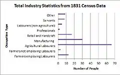 Since the 1881 census on local industries there have been large changes in occupation of residents. Agriculture is no longer the primary industry, with just 18 residents out of the 430 who are aged 16 – 74 and in work. Manufacturing has become the primary industry with 100 people being involved in a type of manufacturing in food, textiles or technology. Overall the employment data has moved with the times, with primary work becoming less prominent within communities, and the prominence of secondary and tertiary industries increasing.