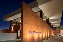 The building's design is the work of the late Mexican architect Ricardo Legorreta. Its central articulator node, dividing flows and functions, is a purple open central courtyard with an ash tree and a reflecting pool, referencing vernacular Mexican architecture.[14] The arrivals hall features car rental facilities, bus agencies, and a snack bar.[18][19]
