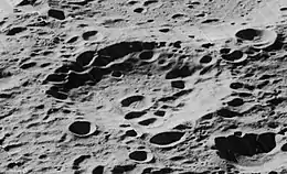 This feature has been battered by subsequent impacts, leaving a series of smaller craters along the rim, inner wall, and floor of the crater. The most recent of these impacts are several small, cup-shaped craters along the eastern rim and inner wall and floor. As a result of this wear, the outer rim is rounded and uneven, although the circular nature of the rim can still be discerned.