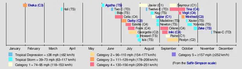 The graphical bar below gives a brief overview of storm activity during the season, and for convenience, the storm's maximum intensity is included as a color bar.