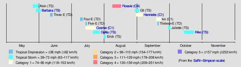 The season officially started on May 15, 2007 in the eastern Pacific, designated as the area east of 140°W, and on June 1, 2007 in the central Pacific, which is between the International Date Line and 140°W, and lasted until November 30, 2007. These dates conventionally delimit the period of each year when most tropical cyclones form in the Pacific basin. The season began slowly; through the end of July, the seasonal Accumulated Cyclone Energy (ACE) was the third lowest since the geostationary satellite era began in the 1966 Pacific hurricane season.[1] The inactivity continued through the next month, which was the third quietest August in terms of ACE since reliable records began in the basin during the 1971 Pacific hurricane season.[2] In June, Tropical Storm Barbara caused $55 million (2007 USD) in crop damage to southeastern Mexico from heavy precipitation.[3] In August, Hurricane Flossie formed in the eastern Pacific and crossed into the central Pacific; the hurricane threatened Hawaii but caused little damage. In early September, Hurricane Henriette dropped heavy rainfall in southwest Mexico, which caused nine fatalities and $25 million (2007 USD) in damage.[4]