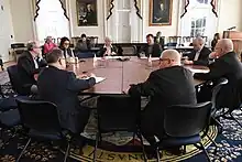 On March 12, Karen Salmon, Maryland's Superintendent of Schools, announced that all public schools would be closed for two weeks beginning March 16.[19] Hogan raised the state's emergency activation system to activate the Maryland National Guard and banned gatherings of more than 250 people.[18] Hogan suspended visits to state prisons and stipulated hospitals to implement policies to limit visitors. Employees of the Government of Maryland were ordered to remote work if they were able to do so.[19] The National Guard was activated to a higher state of readiness.[20] Hogan delegated routine state government operations to Lieutenant Governor Boyd Rutherford so he could allocate more time to combating the virus.[19]
