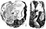Tyrannosaur remains were among the first dinosaur fossils collected in the United States. The first of these was named Deinodon horridus by Joseph Leidy. However, as this species was based only on teeth the name would fall into disuse.[4] Soon after, Edward Drinker Cope described Laelaps aquilunguis from a partial skeleton in New Jersey. Its discovery heralded the realization that carnivorous dinosaurs were bipeds, unlike the lizardlike megalosaurs sculpted for the Crystal Palace.[5] Laelaps was also among the first dinosaurs to be portrayed artistically as a vigorous, active animal, presaging the Dinosaur Renaissance by decades.[6] Later in the century, Cope's hated rival Othniel Charles Marsh would discover that the name Laelaps had already been given to a parasitic mite, and would rename the dinosaur Dryptosaurus.[7]