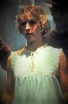 ![]() A production still of A Nightmare on Elm Street of Amanda Wyss filming the film's opening with Robert Englund as Freddy Krueger on the background. | |