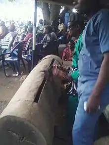 The Kakaki is a royal trumpet used in many West African groups in Nigeria, Niger, Chad and Burkina Faso.[12] This is an instrument used to convey special messages to the people of the community, such as the birth of the child of the King, his naming ceremony, the crowning of a new king, or to gather people together during the marriage ceremony of the king and the king's son's marriage ceremony.[13] This instrument was used to convey all the messages to the people to assemble at the square for the ceremony. When there is an enemy attack on the community, a warning sound of the Kakaki is blown to alert those who can defend the society and every citizen to be alert.[14]