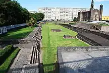 Tlatelolco is an archaeological excavation site in Mexico City, Mexico where remains of the pre-Columbian city-state of the same name have been found. It is centered on the Plaza de las Tres Culturas. On one side of the square is this excavated Tlatelolco site, on a second is the oldest European school of higher learning in the Americas called the Colegio de Santa Cruz de Tlatelolco, and on the third stands a mid-20th-century modern office complex, formerly housing the Mexican Foreign Ministry, and since 2005 used as the Centro Cultural Universitario of UNAM (National University of Mexico).[1]