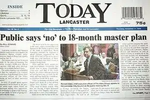 - ↑ "Today Newspapers will cease publication of its Lancaster Today with the Dec. 28 edition". Lancaster Today. 2006-12-19. Retrieved 2009-07-10.