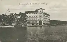 After the success of the first Tokatlıyan hotel, Meguerditch Tokatliyan opened another branch at Tarabya in 1909 on a site long occupied by a hotel, first by the Hotel Petala and then the Hotel d'Angleterre (Tarabya was a popular retreat from the heat of central İstanbul in summer with wealthy Turks and foreigners).[13][14][15] It consisted of 120 rooms on the European shore of the Bosphorus.[7] Like its predecessors on the site, the hotel became popular immediately.[7] However, on April 19, 1954, it was badly damaged by fire.[7][13][16][17] In 1964 the hotel was reconstructed and its name changed to the Büyük Tarabya (Grand Tarabya) Hotel.[7]