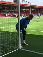 He recovered from a blunder in a pre-season friendly to establish himself as the first choice keeper for the 2017–18 season.[22] He made a shaky start to the campaign but would finish it in impressive form, making 49 appearances in all competitions and keeping 10 clean sheets.[23][24] He kept his place for the 2018–19 season, making 52 appearances over the course of the season, keeping 15 clean sheets.[25] Manager Steve Lovell instructed him to take more command of his penalty area and was pleased with the Czech's subsequent improvement.[26] Holý was offered a new contract by Gillingham after refusing to enter negotiations until safety from relegation was confirmed, though he ultimately declined the offer anyway.[27][28] Chairman Paul Scally had previously admitted that only promotion into the Championship could change Holý's mind.[29]