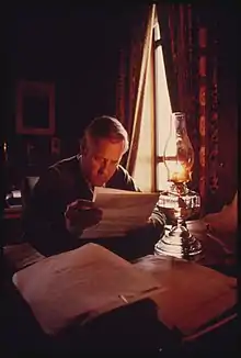 Governor McCall reads by kerosene lamp to draw attention to the energy crisis, 1973