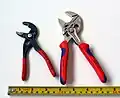 They have serrated jaws generally set 45 to 60 degrees from the handles. The lower jaw can be moved to a number of positions by sliding along a tracking section under the upper jaw. An advantage of this design is that the pliers can adjust to a number of sizes without the distance in the handle growing wider. These pliers often have long handles—commonly 240 to 300 mm (9.5 to 12 inches) long—for increased leverage.[1][2][3] The weight of the tool can also vary, depending on the material used.